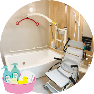 からだの大きさによって、浴槽に浸かるか、バスプールに浸かるかを保護者の方と相談して決めていきます。人工呼吸器や酸素吸入が欠かせないお子様の入浴も対応させていただいております。